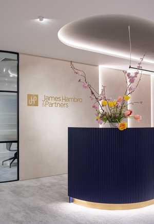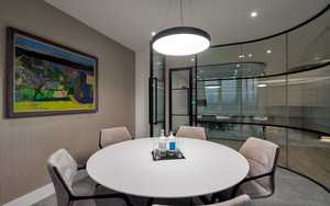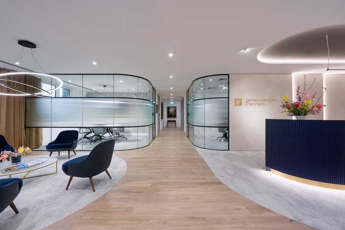 As part of the 13,800sq ft refit the reception and meeting rooms were reconfigured to increase capacity while still maintaining the views and natural light levels. A modern yet timeless approach to the interior was crucial, so we used a palette of textured French oak, natural stone with soft yet dynamic lighting helping to give character to the space. Rich tones of dark blue and brass to the reception desk and Walter knoll seating were used to give an impressive contrast. As part of the personalisation process, we identified a sublet curve that ran through the new branding. So we maintained this design language in all the selected pieces of furniture and feature lighting as well as the curved glazing and bespoke joinery details that help to sweep you through the entire space.